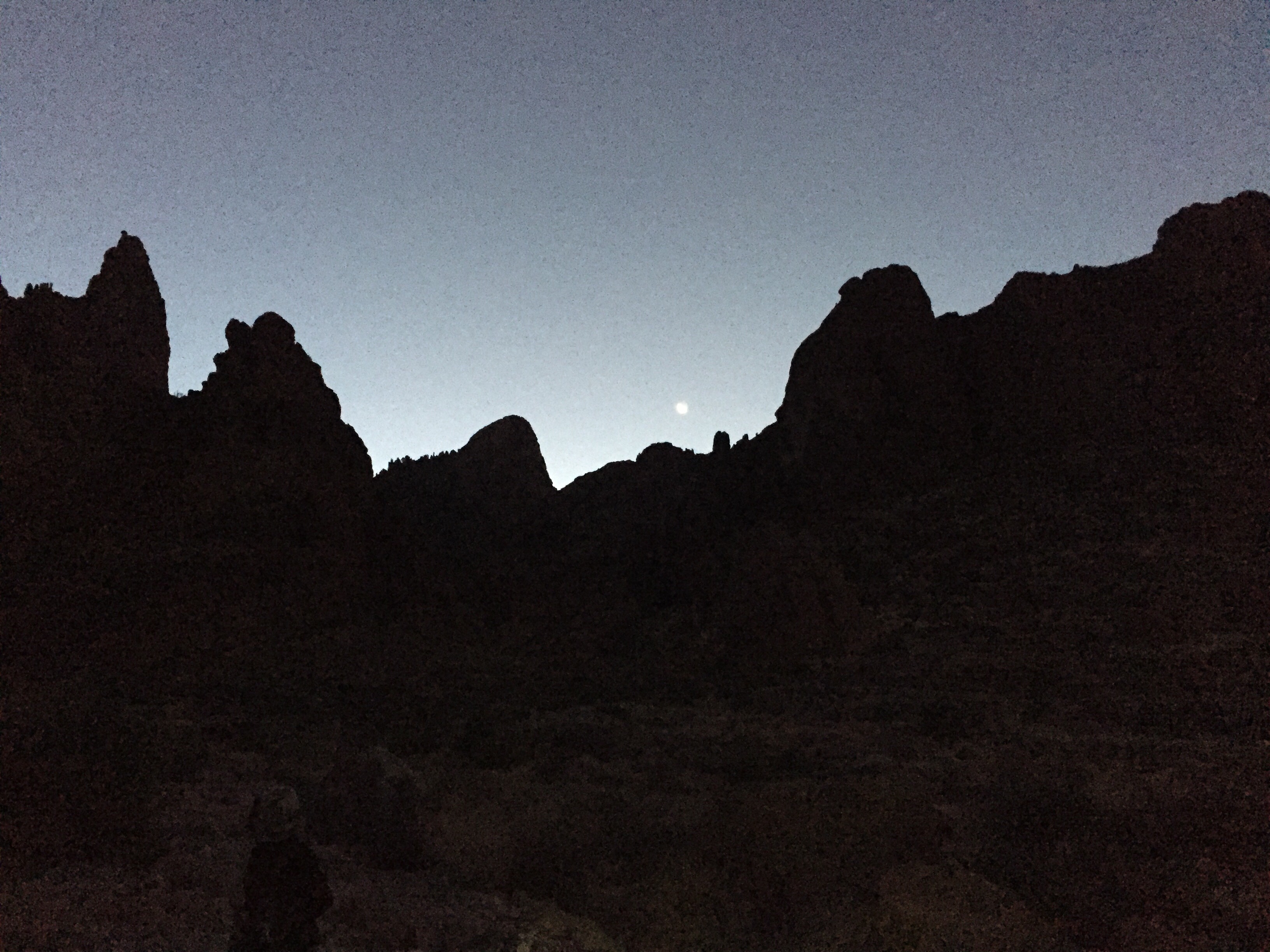 We started at 6 am. In the pitch dark night, the moon was just a curved silver line. Under the starry sky, only a dim silhouette of the jagged mountain range was visible, An owl hooted in the distance. However, soon the form of the mountain became visible.