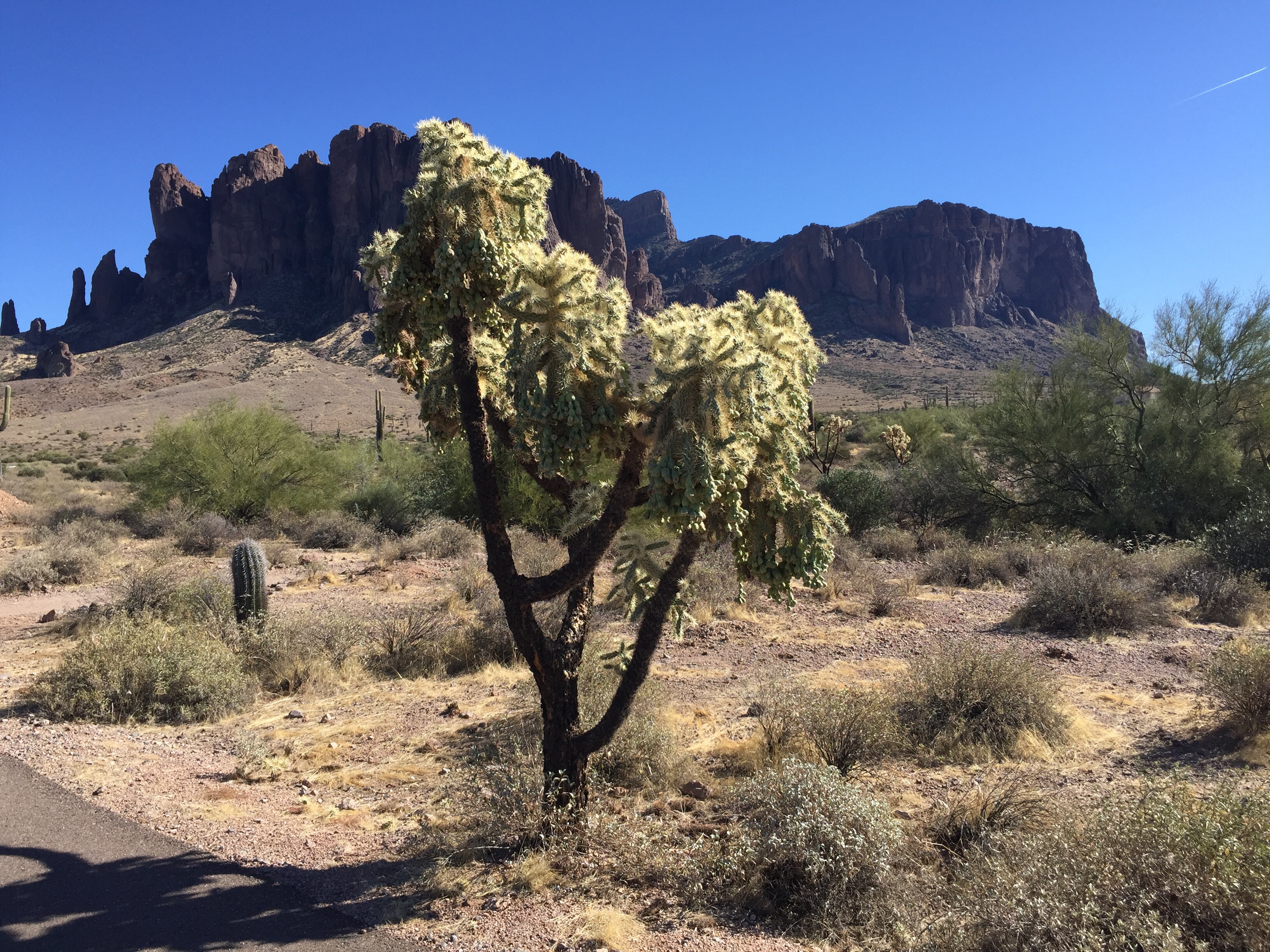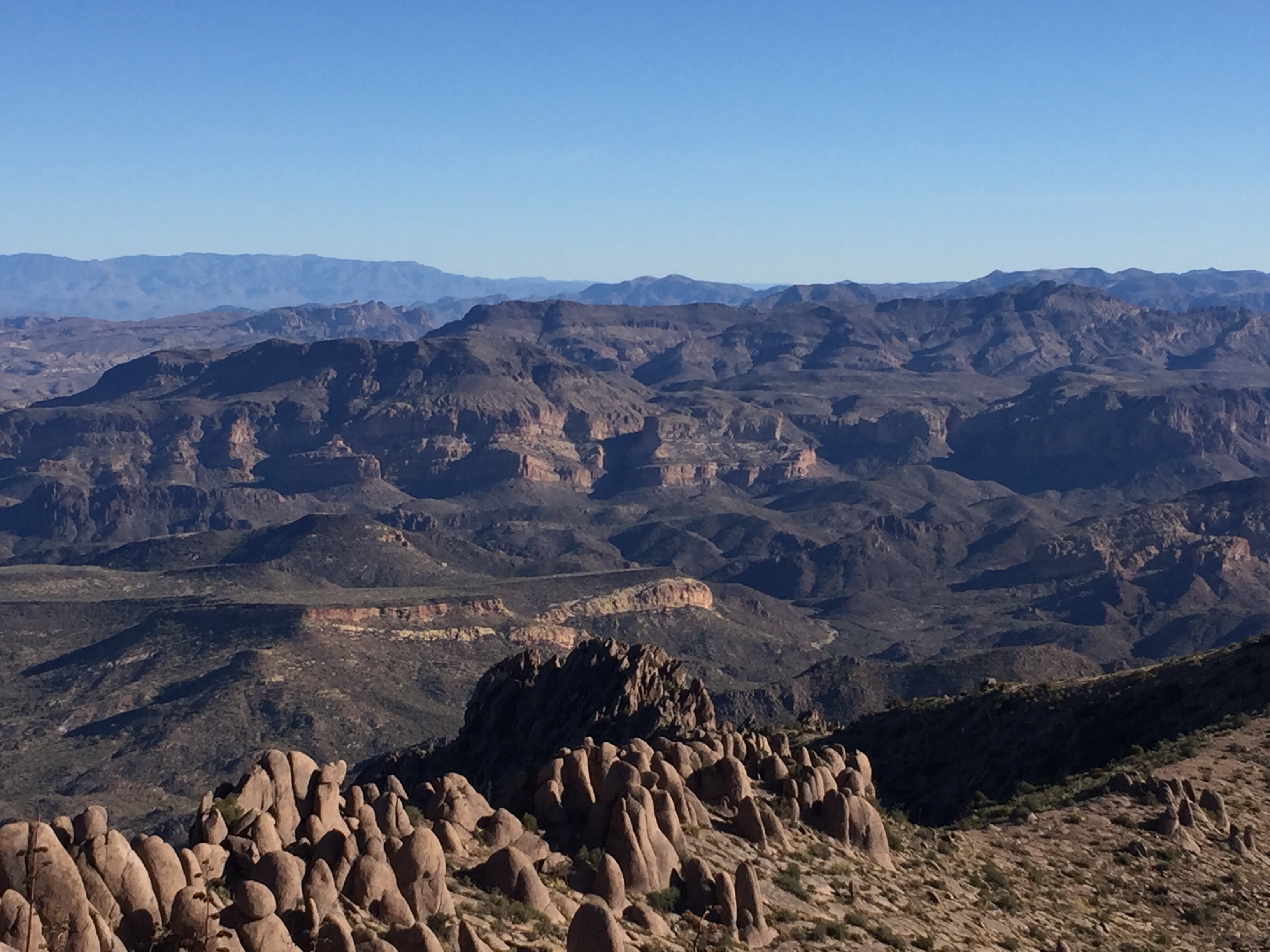 View back to the Superstition Mountains with the Flatiron Mountain top.