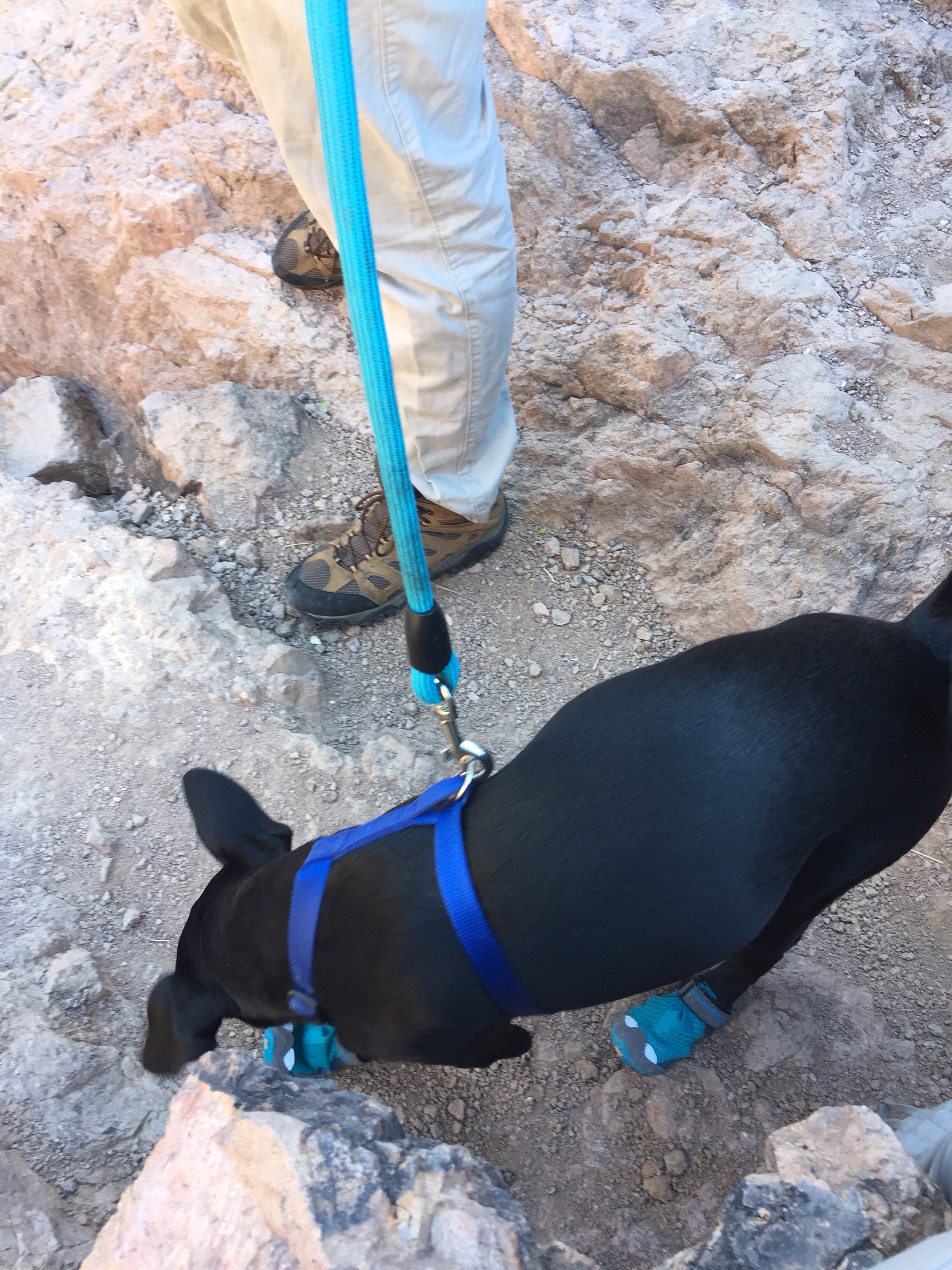 The three mile climb down was more difficult than the climb up. There were a lot of young people coming up the trail now, some of them came with their dogs. Â Sometimes, the dog was not brave enough to climb up the nearly vertical slope. One dog wore shoes.