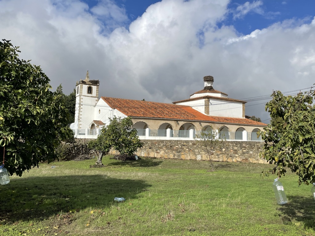 A beautiful building with several stork nests on its top – Erimita de la Virgin del Pilar (15th century) at the end of the village “Casas de Don Antonio
