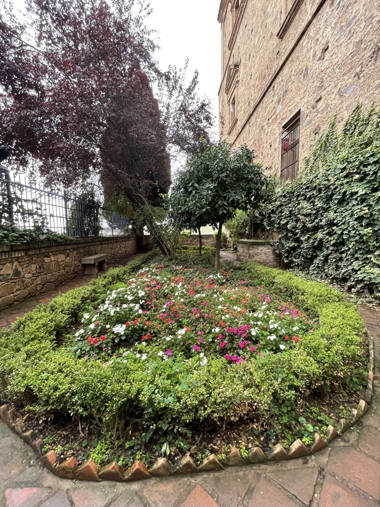 San Francisco Javier, a Jesuit church. On the lower plaza, there are two modern doors to the left, looking like garage doors. This is an entrance to a truly magical garden